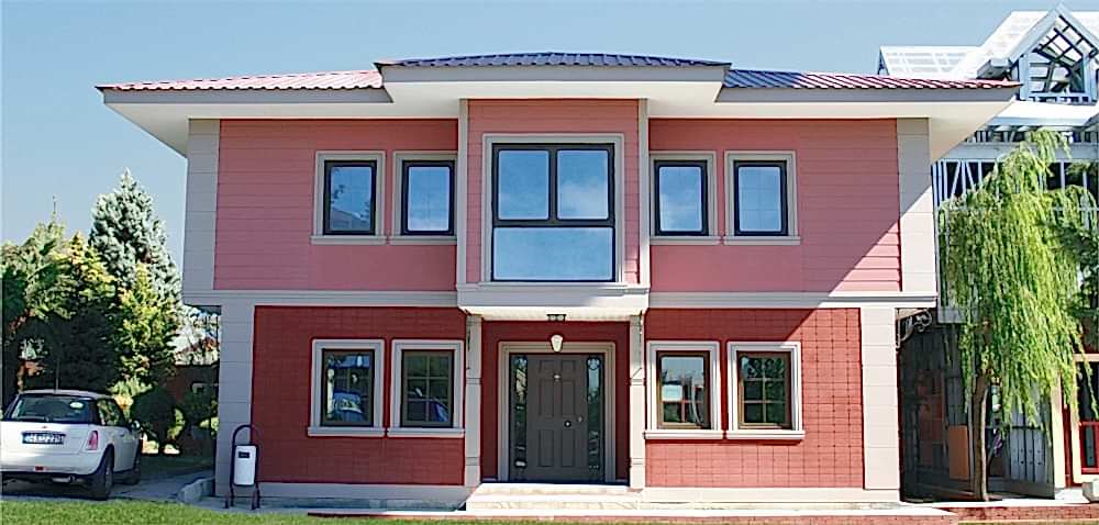 Prefabrik evlerin taşıyıcı kontrüksiyonu ST52 yüksek yoğunluklu galvanizli çelikten kaynaksız olarak üretilmektedir. Çelik evlerin bütün bağlantıları civata somunla sağlanmaktadır. Bu hazır evlerde cephe kaplamaları HEKiMBOARD marka FiBERCEMENT (silika bazlı çimentolu hazır levha) veya TURKSiDiNG marka yalıbaskı yada tuğla desenli levhalarla yapılmaktadır. Bu yapı diğer tüm hazır konutlarda da korunmaktadır. Prefabrik ev fiyatları betonarme yapılara göre çok daha uygun olmaktadır.