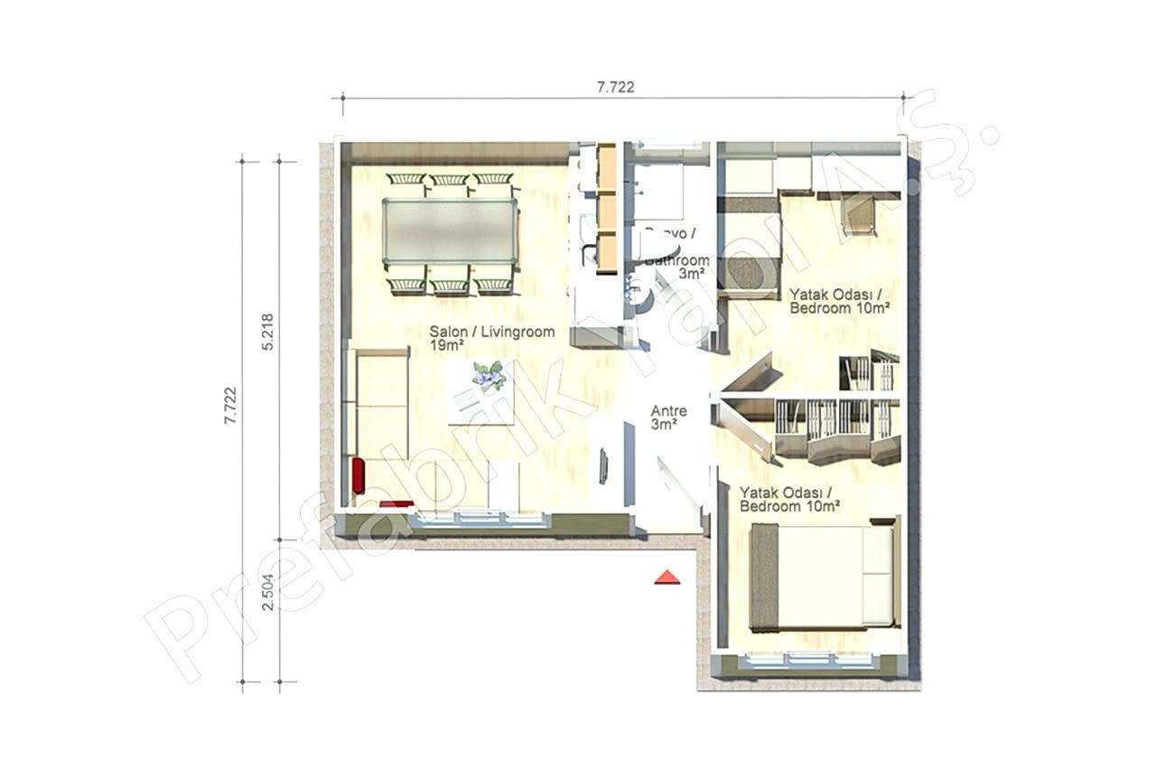 7.722 x 7.722 m boyutlarına sahip olan Avanos prefabrik eve, 3 m2 büyüklüğünde antreden girilebiliyor. L formunda tasarıma sahip olan ev, açık mutfağa yer verilen 19 m2 büyüklüğünde salonuyla dikkat çekiyor. Oturma odası olarak kullanılabilecek salonun hemen yanında duş teknesi, lavabo ve tuvaletin bulunduğu 3 m2 büyüklüğünde bir banyo bulunuyor. Son olarak, tasarımı sayesinde çift kişilik yatak, büyük kıyafet dolapları ya da kitaplık ve çalışma masasının rahatlıkla yerleştirebileceği 10 m2’lik iki ayrı yatak odasına yer veriliyor.