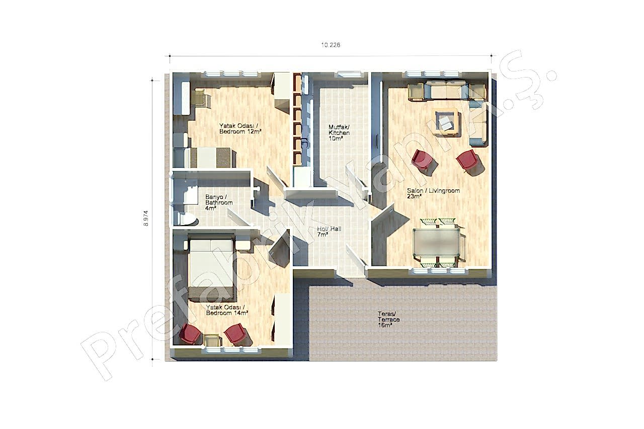 Dalyan prefabrik ev, 92 m2 alanıyla geniş ve ferah bir konut isteyenlerin tercihidir. Hem ev hem de ofis olarak kullanılabilecek tek katlı ev, tam 16 metrekare teras kısmı ile balkon keyfi sevenlere alternatif oluşturur.