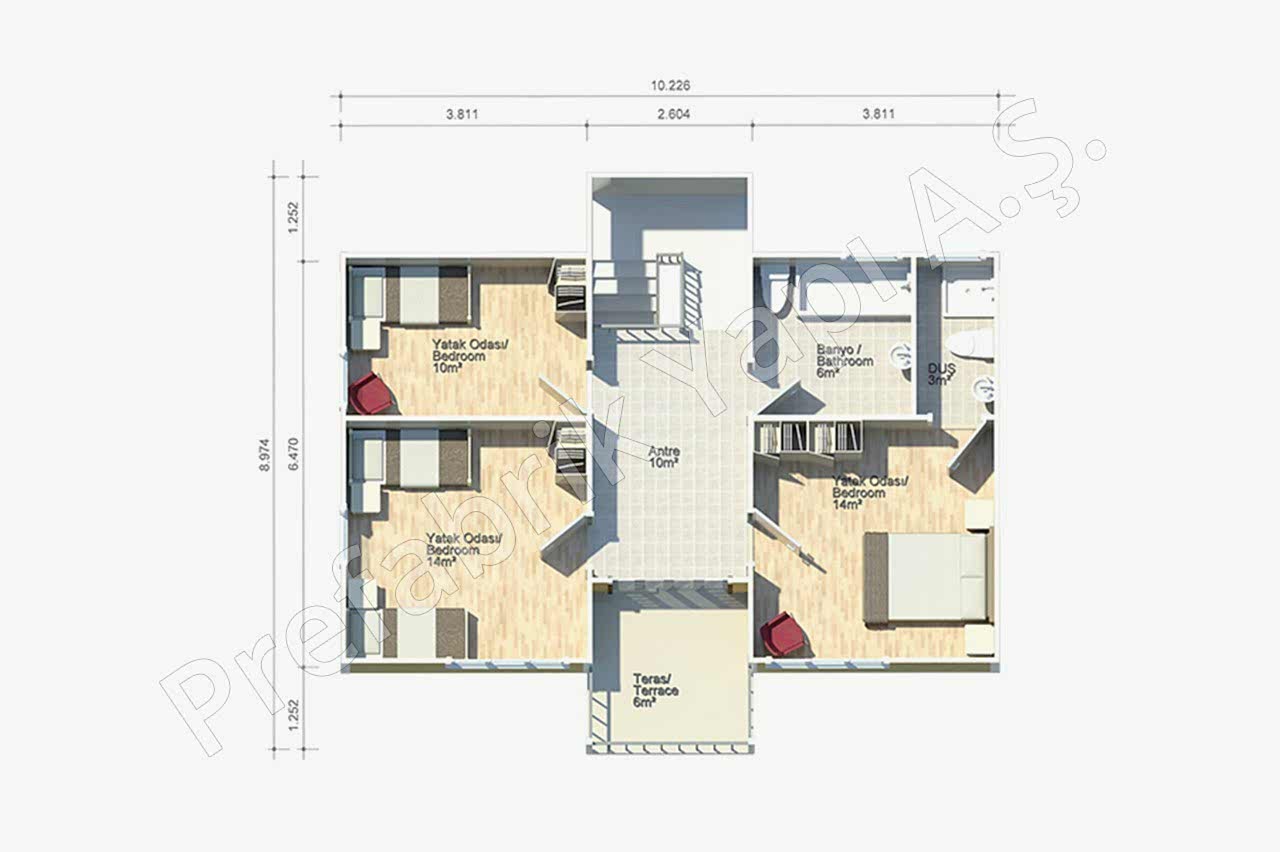 Evin üst atında üç yatak odası yer alır. 10 metrekare alanında bir, 14 metrekare alanında iki yatak odası bulunur. Yatak odalarından birinin kendine ait duşu vardır. Üst katta teras 6 metre kare, banyo 6 metrekare, duş 3 metrekare ve antre 10 metrekaredir. Geniş terasa antreden girilerek evin konforlu mimarisinin tadı çıkarılabilir.