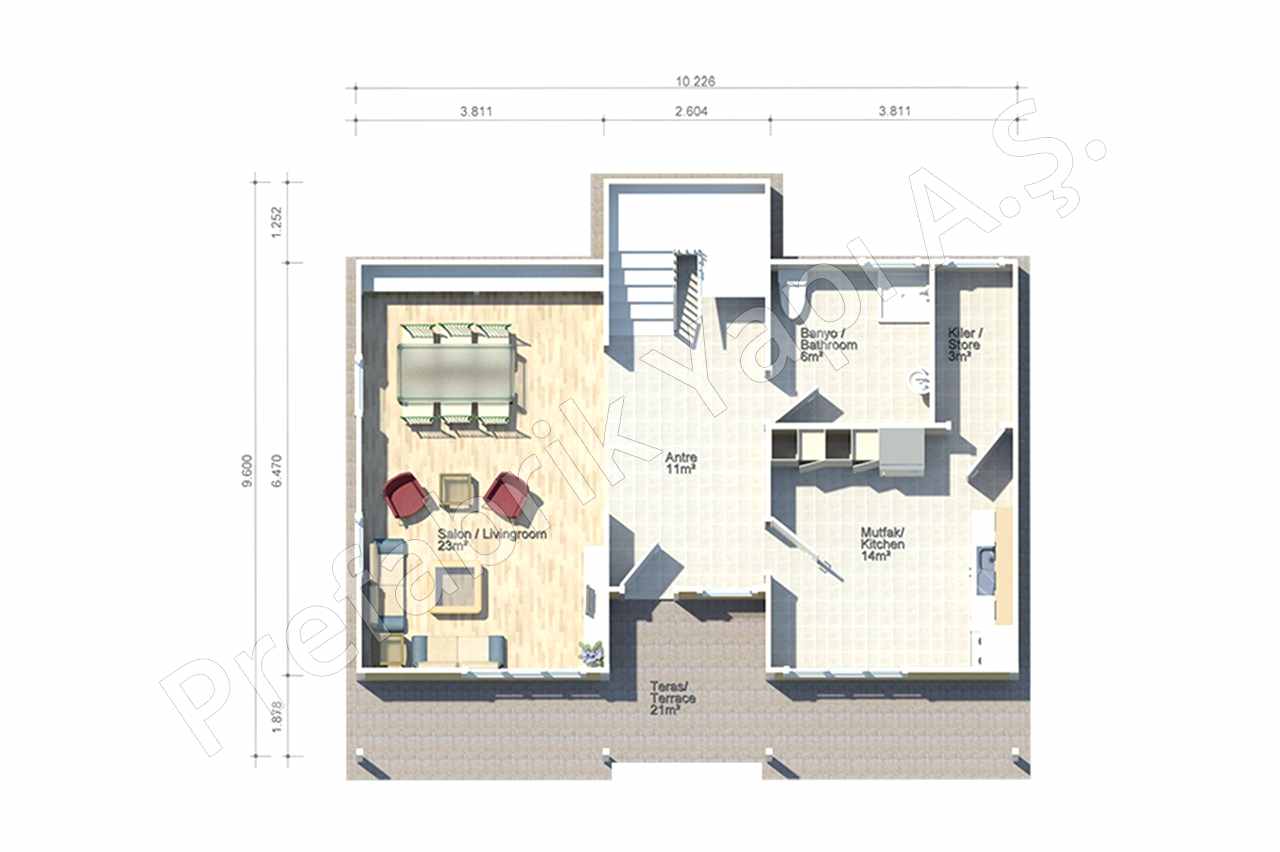 21 metrekarelik geniş teras, kullanıcılara veranda keyfi için imkan tanır. Alt katta salon, mutfak, antre, banyo ve kiler yer alır. Depo alanına ihtiyaç duyanların tercihi olan ev, antreden uzanan merdivenlerle üst kata çıkmanızı sağlar. Salon 23, mutfak 14, banyo 6, kiler 3, antre ise tam 11 metrekaredir. Her oda genişliği ile ferahlık isteyenleri memnun eder. Oturma takımları, yemek takımları salona rahatlıkla sığar.